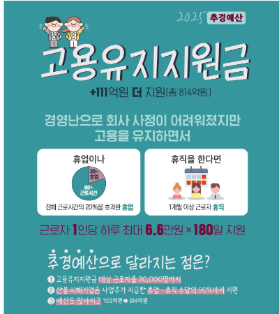 | 근로시간 단축 | 30~50% 단축 | 단축 임금의 50~70% 지원 |