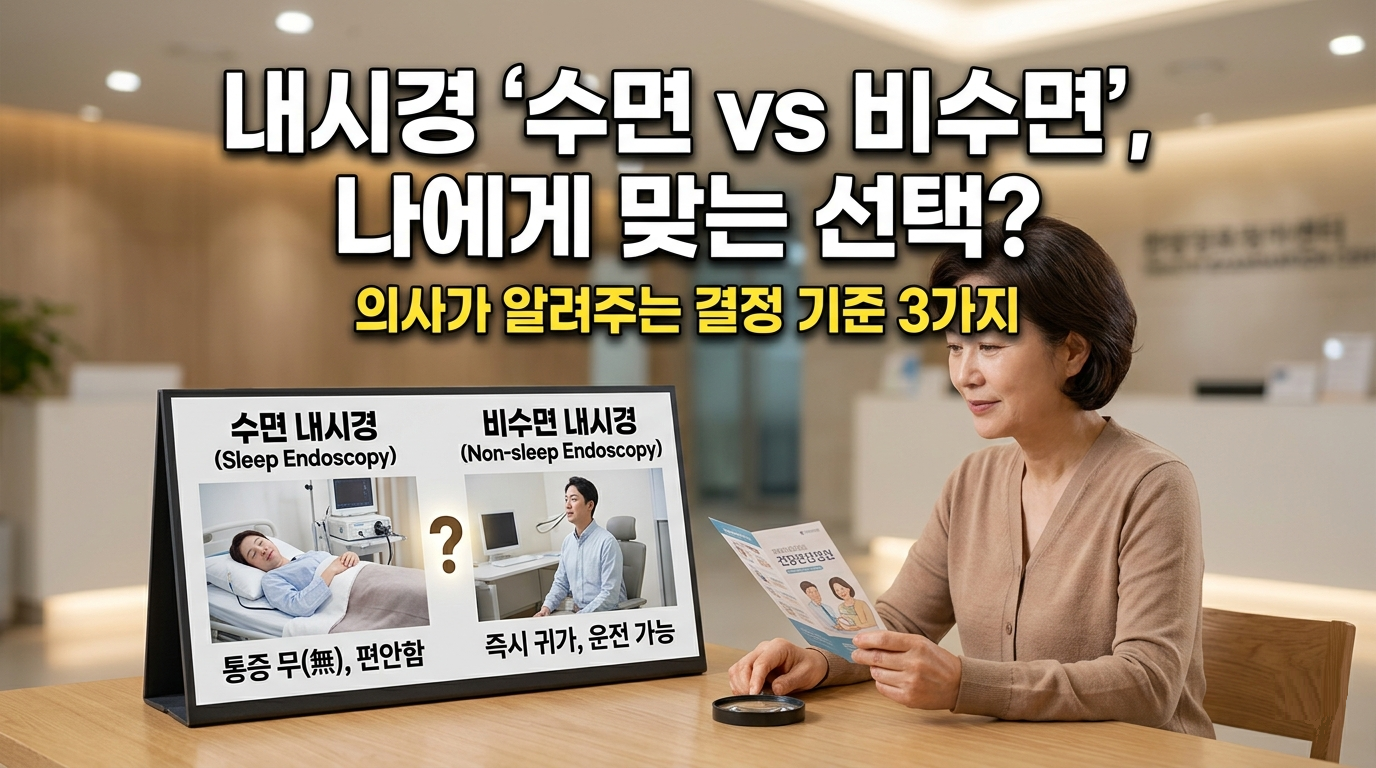 건강검진 예약할 때 가장 마지막까지 망설여지는 결정, 바로 **'수면으로 할 것인가, 생으로 할 것인가'**입니다. 수면으로 하자니 혹시 모를 부작용이나 기억이 안 나는 상태가 불안하고, 비수면으로 하자니 그 고통과 헛구역질을 참아낼 자신이 없으시죠? 인터넷에는 "비수면은 지옥이다", "수면은 위험하다" 등 상반된 후기만 가득해 결정을 더 어렵게 만듭니다.